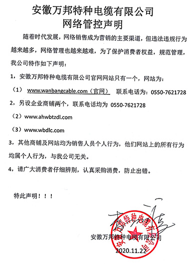 鄭重聲明:安徽萬邦特種電纜有限公司官方網站為:www_wanbangcable_com.fqdianmao.cn,除此之外無任何子網站或合作網站,其余均為假冒偽劣。電話:0550-7621728 13485756353 地 址:安徽省天長市滁州高新技術產業開發區經四路29號